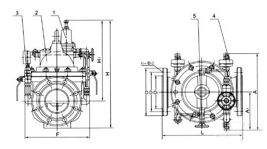 200X減壓穩壓閥部件列表: 1、導閥2、主閥3、球閥4、壓力表5、針表 |