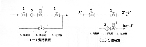 3、在電磁閥發生故障時,為了及時隔離電磁閥,并保證系統正常運行,最好安裝旁路裝置(如圖一)。