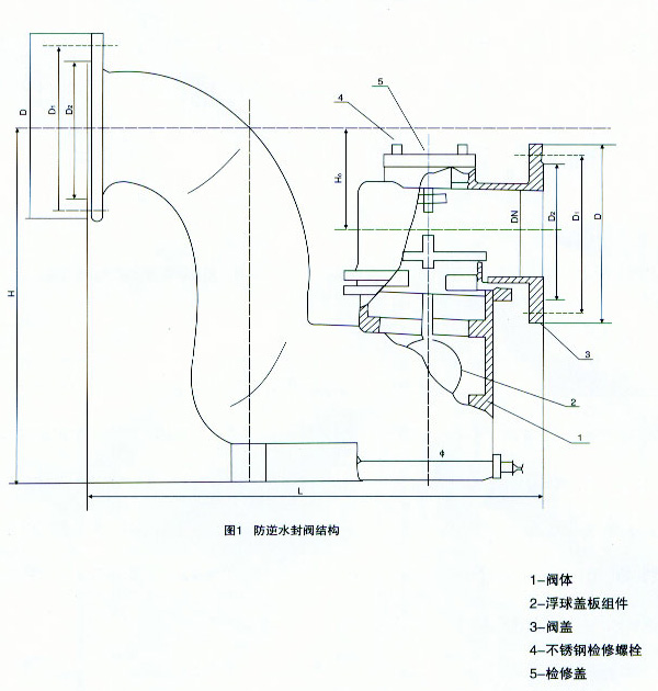 | 詳細內容: 一、F43X雙封自凈式防逆水封閥概述 F43X雙封自凈式防逆水封閥是我公司技術人員研制開發的最新產品,主要應用于清蓄水池溢流管道上,平時因閥內有水封可阻止下水道臭氣進入清水池,因大雨或下水道堵塞等造成雨污水管水位增高時可阻止污水倒流清水池,是良好的供水衛生保護裝置。 二、F43X雙封自凈式防逆水封閥性能特點 本閥結構簡單,溢流順暢無阻,具有雙重水封作用,阻隔臭氣及污水倒灌,性能可靠,效果良好,且污水倒灌時所帶雜物不影響密封性能。 三、F43X雙封自凈式防逆水封閥工作原理 F43X-1.0T防逆水封閥主要由帶存水彎的閥體及浮球蓋板組件等組成,帶浮球的蓋板蓋在閥體的密封閥座上,將閥腔分成內外兩部分,內腔為清水部分,外腔通排水管道,當內腔充滿清水時.因位于內腔的浮球作用,蓋板壓力降低,易于開啟通流。溢流停止后,蓋板可白行復位.蓋嚴閥座,從而可嚴格阻斷臭氣及污水倒灌。如果水池進水口浮球閥關閉良好,數年不溢流,閥腔無水,浮球可加重蓋板重量,更好地蓋嚴閥座,同樣可嚴格阻隔臭氣及防止雨、污水倒灌清水池。如果污水進入閥體外腔,所帶雜物僅能粘附在蓋板外表面,不影響蓋板封嚴閥座。故該防逆水閥工作可靠,效果好,不易出故障。且當有雜物沉淀時.下次溢流時可自動沖出閥體。 四、F43X雙封自凈式防逆水封閥結構形式及外形安裝尺寸 F43X雙封自凈式防逆水封閥1所示;安裝尺寸見表1