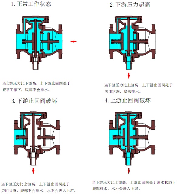 DSBP741X低阻力倒流防止器是在閥門系統增設一個排水泄壓裝置,這樣即使二級止回密封同時破壞,其也能起到防止回流污染的作用。其工作原理: